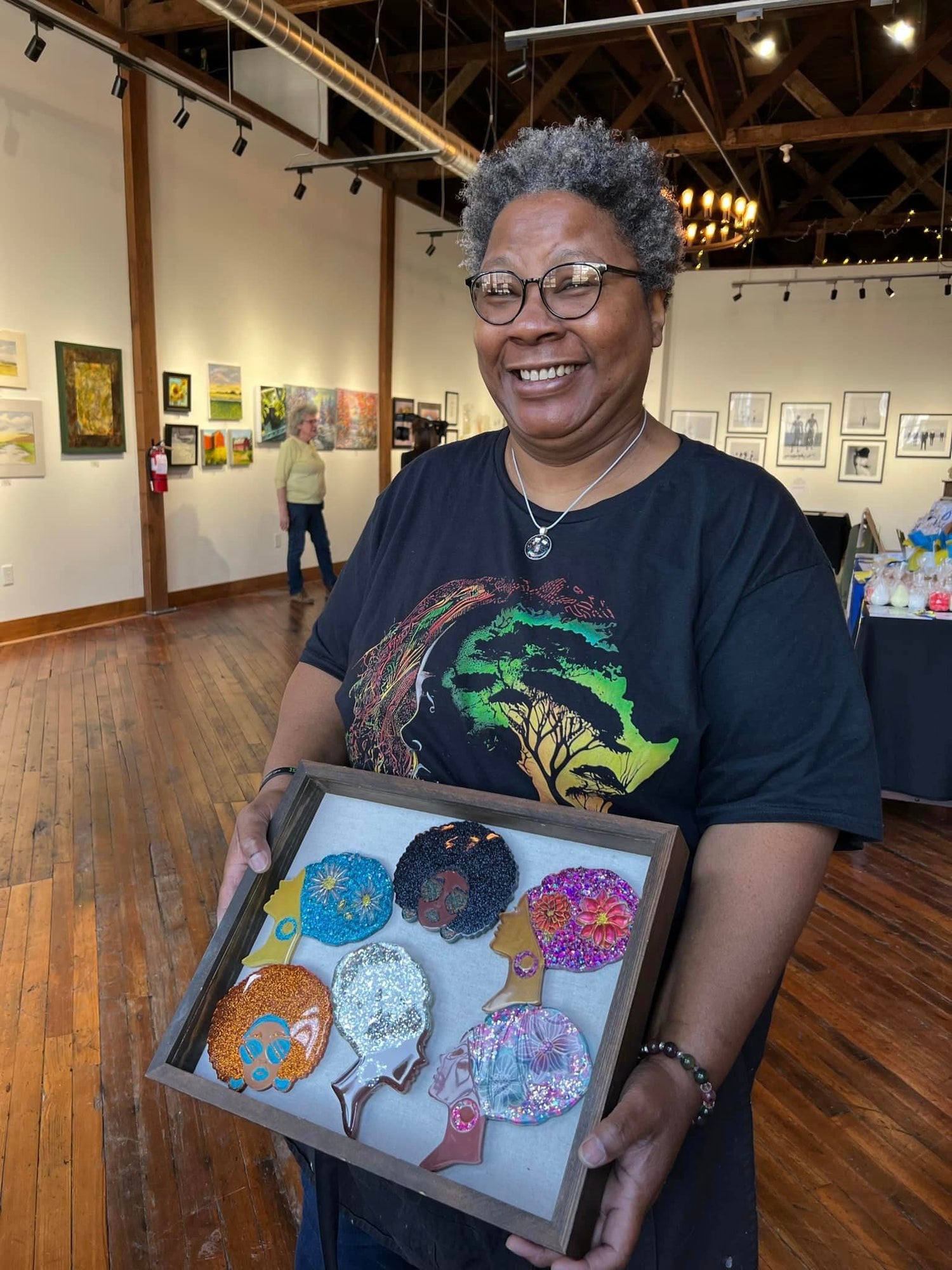 I was born, raised, and still live in Johnson City, TN. I believe that this small, typically conservative, town forced me to find alternative creative outlets even as a child. As I grew up, my artistic nature was not valued in my family, so I didn’t tap in to my creative side for many years. During the pandemic I began to desire to create again, this time as an adult with no rules or lines to color within. I find the most joy working with mixed media by combining ordinary things with other mediums that don’t traditionally “fit” together; much like myself. I have found great joy and healing via this avenue and am excited to be able to share it with folks that appreciate it and find their own joy through my lens.