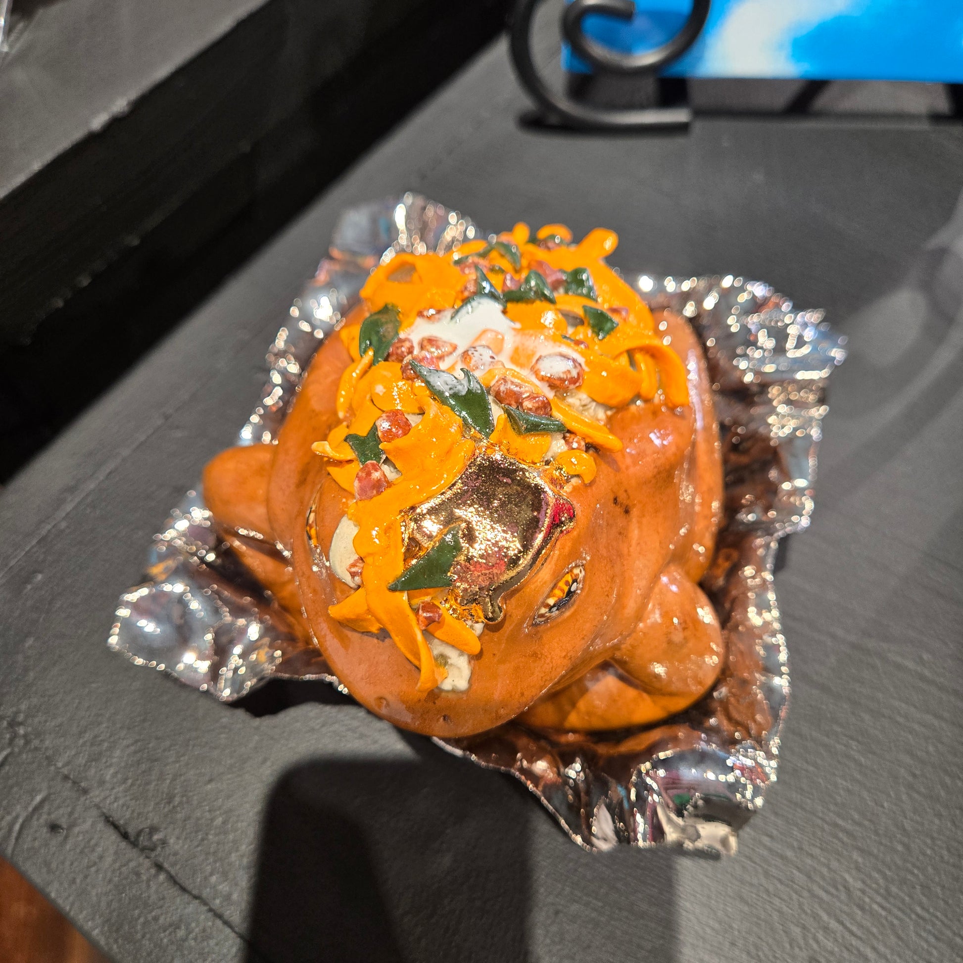 Cast and altered stoneware, topped with 22k gold lustered butter, hand painted toppings, and melty gloop-glaze sour cream. Served on a handbuilt ceramic dish lustered in genuine white gold. Complimented with Frog’s Eye View as a side